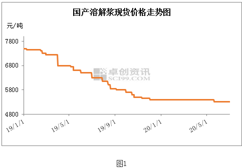 2020年上半年溶解漿價(jià)格窄幅下行,國產(chǎn)闊葉溶解漿含稅到廠價(jià)均價(jià)5377元/噸,較去年同期下降23%。從圖1可以看出今年上半年變化幅度不大,去年四季度漿價(jià)已降至近五年新低,來到國產(chǎn)漿廠生產(chǎn)成本線附近,幾無調(diào)價(jià)空間。2020年一季度受到公共衛(wèi)生事件影響,溶解漿市場交投清淡,國產(chǎn)漿成交價(jià)低位盤整。二季度終端出口訂單減少,溶解漿市場延續(xù)弱勢運(yùn)行,漿價(jià)承壓窄幅下行,5月份國產(chǎn)闊葉溶解漿含稅到場價(jià)下探至5300元/噸。漿價(jià)持續(xù)低迷原因是: