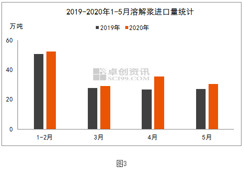 進(jìn)口木漿價(jià)低量足:如圖2所示,進(jìn)口闊葉溶解漿外盤走勢基本與國產(chǎn)溶解漿同步,2019年四季度紙2020年一季度持穩(wěn)于630美元/噸附近,根據(jù)當(dāng)時(shí)人民幣匯率計(jì)算,一季度闊葉進(jìn)口成本在5050-5200元/噸;二季度因人民幣匯率持續(xù)貶值,進(jìn)口成本增加,粘短廠家壓價(jià)采買,闊葉漿外盤連續(xù)下調(diào)至610美元/噸,二季度闊葉漿進(jìn)口成本進(jìn)口成本在5000-5230元/噸。由此可見進(jìn)口溶解漿價(jià)格一直低于國產(chǎn)闊葉漿,粘短廠家傾向采買外盤來降低成本。那進(jìn)口溶解漿供應(yīng)情況又怎么樣呢,如圖3是近兩年1-5月進(jìn)口量對比圖,可以看到2020年各月進(jìn)口量均多于2019年,前五個(gè)月進(jìn)口量148萬噸,同比增長12%,進(jìn)口漿價(jià)低量足擠壓國產(chǎn)溶解漿銷售空間。