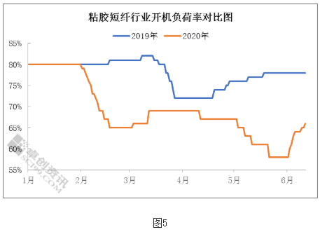 粘短開工率低于同期:如圖5所示,2020年粘短行業(yè)開工負(fù)荷明顯低于去年同期,一季度主要受國內(nèi)公共衛(wèi)生事件和春節(jié)假期影響,二季度則是市場需求收緊,且價(jià)格走低,開工偏弱整理,溶解漿消耗量減少,采買周期延長。