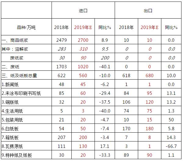 根據紙漿造紙行業2019年前9個月的生產、銷售和進出口數據,以及對今年后續生產、市場需求及進出口情況的調研,我們預計全年紙漿、廢紙和紙及紙板進出口、生產與消費情況如下: