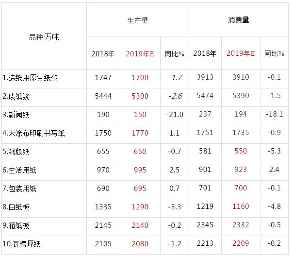 根據上述數據和分析,我們預計2019年全年國內制漿和造紙生產量和消費量為: